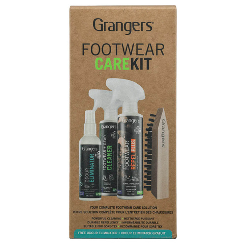 - FOOTWEAR CARE KIT to kompletny zestaw składający się ze szczotki oraz trzech preparatów zatwierdzonych przez Bluesign®: FOOTWEAR + GEAR CLEANER, FOOTWEAR REPEL PLUS, ODOUR ELIMINATOR. Przeznaczenie: buty, plecaki, inny sprzęt outdoorowy.
