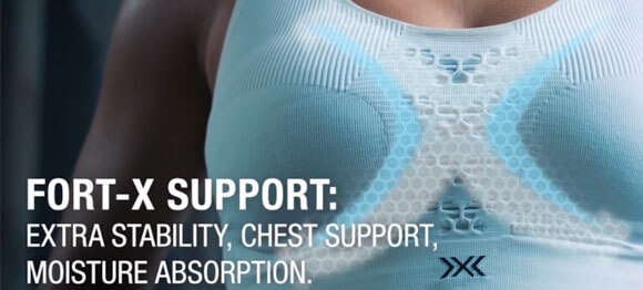 Fort X-Support to poziome żebra ułożone w kształt litery X, które pomagają stabilizować biust i przeciwdziałać niekomfortowym wibracjom, by zagwarantować najwyższy komfort użytkowania biustonosza. Kolejną ich funkcją jest odprowadzanie wilgoci na zewnątrz, dzięki czemu skóra jest bardziej sucha, a więc mniej podatna na nieprzyjemne otarcia, odparzenia i podrażnienia. Fort X-Support zapewnia dodatkowo odpowiednią izolację termiczną, gdy organizm nie wytwarza dużych ilości potu. Dzięki temu ubranie staje się bardziej wszechstronne i doskonale sprawdza się zarówno podczas wyższych, jak i niższych temperatur.