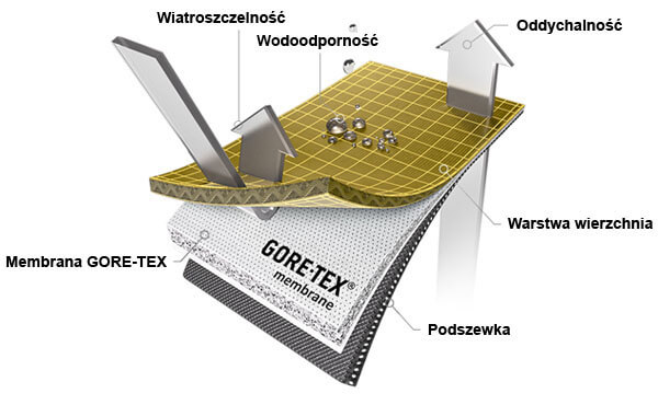 Cała konstrukcja materiału Gore-Tex 3L obejmuje trzy warstwy. Pierwsza z nich - warstwa zewnętrzna - jest odpowiednio trwała oraz posiada zdolność do swobodnego przepuszczania pary wodnej, która, zamiast zalegać pod kurtką, wydostanie się swobodnie na zewnątrz. Kolejna warstwa to ulokowana w środku wodoodporna membrana o unikalnej mikrostrukturze, wykonana w całości z ePTFE. Trzecią warstwę, tę znajdującą się najbliżej ciała, stanowi oddychający materiał, który ochroni membranę przed uszkodzeniem, a dodatkowo zwiększy komfort noszenia odzieży. Poszczególne warstwy, dzięki trwałemu zespoleniu, nie ulegają przemieszczaniu się względem siebie. Oznacza to, że materiał zachowa na znacznie dłużej swoje fabryczne parametry - oddychalność oraz wodoodporność membrany nie będzie zmniejszać się wraz z użytkowaniem odzieży.