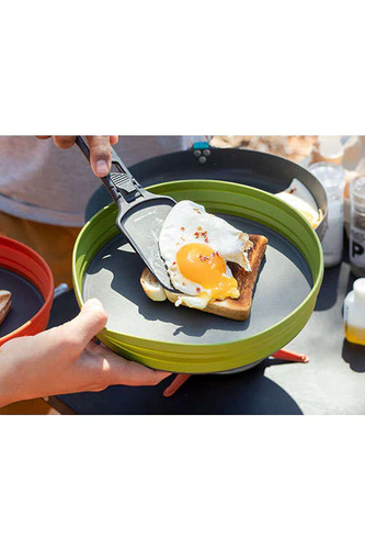 Szpatułka Folding Spatula będzie idealnym dodatkiem do Twojej kuchni obozowej. Posiada składaną konstrukcję, dzięki czemu nie zajmuje dużej ilości miejsca w bagażu (zmieści się wtedy w wielu naczyniach Sea To Summit, np. w garnku Alpha 1,2L). Po rozłożeniu natomiast zamienia się w pełnowymiarową szpatułkę, która okaże się niezwykle pomocna np. podczas przenoszenia bądź przewracania pożywienia. Na jej uchwycie znajdują się otwory, dzięki którym jest jeszcze lżejsza, a dodatkowo można ją troczyć. Szpatułka wykonana została z nylonu wzmocnionego włóknem szklanym - materiału, który jest mocny, odpowiednio elastyczny, a także odporny na wysokie temperatury (może mieć kontakt np. z wrzącą wodą). Można ją także bez obaw myć w zmywarce.