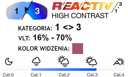 - zastosowany fotochrom odpowiada za bardzo szybkie dostosowanie soczewki do panujących warunków oświetleniowych, poprzez zmienianie kategorii filtrów od 1 do 3 (współczynnik przepuszczalności światła widzialnego: 16% - 70%),